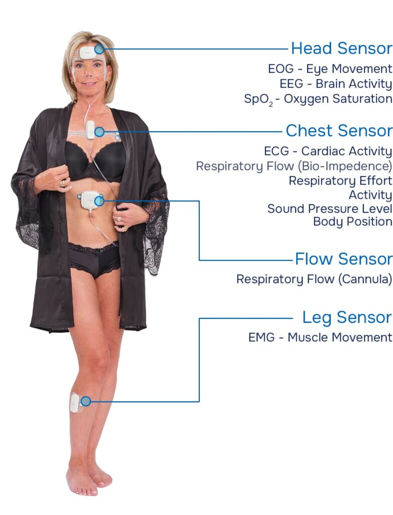 Four no-wires sensors are applied by patch to the forehead, upper chest, abdominal area and lower leg for maximum patient comfort during sleep. The patches can be attached within minutes, offer unprecedented ease-of-use and comfort to the patient and save valuable time during set-up and removal of the system.